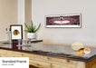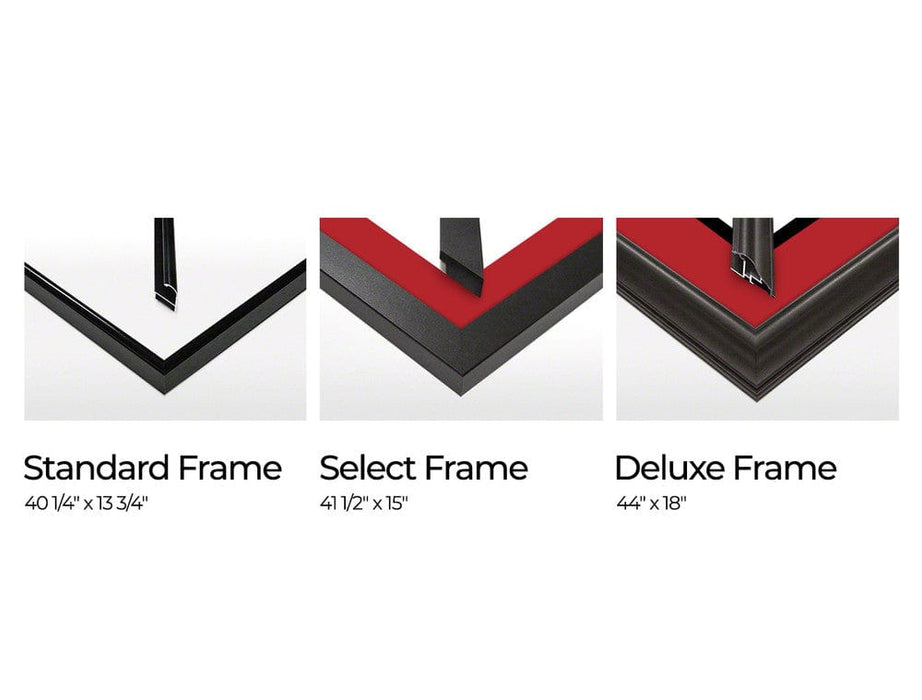 - Deluxe Frame - 44" wide x 18" tall: The print has a border in the team's secondary color (if applicable), and a bevel-cut mat in the team's primary color (if applicable). The frame moulding is a 1 1/8" wide contoured aluminum. Ready-to-hang with attached picture wire.