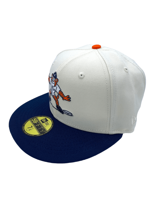 Represent your Detroit Tigers with this exclusive custom design. This New Era Men's 59FIFTY fitted hat offers a new mascot design of the beloved Twins mascot, TC Bear. The metallic stitched, chrome top, navy bill and also features a gray undervisor.